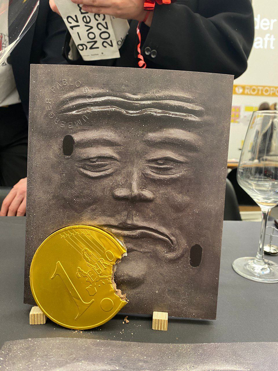 The publication 1 is a hybrid; it’s a fusion of artist book, monograph and field report. It thematically revolves around Pablo Schlumberger’s euro figurine, a sculpture made from nine one-euro coins that was stolen from Schlumberger’s studio in 2017. Since the disappearance of the sculpture, he has repeatedly created drawings, watercolors, underwater photographs, sculptures and installations that imagine the existence and examine the absence of the sculpture. They draw a picture of something that was or that could have been. The book 1 draws up an interim balance to this body of work and simultaneously is part of this ongoing examination of the vanished sculpture.