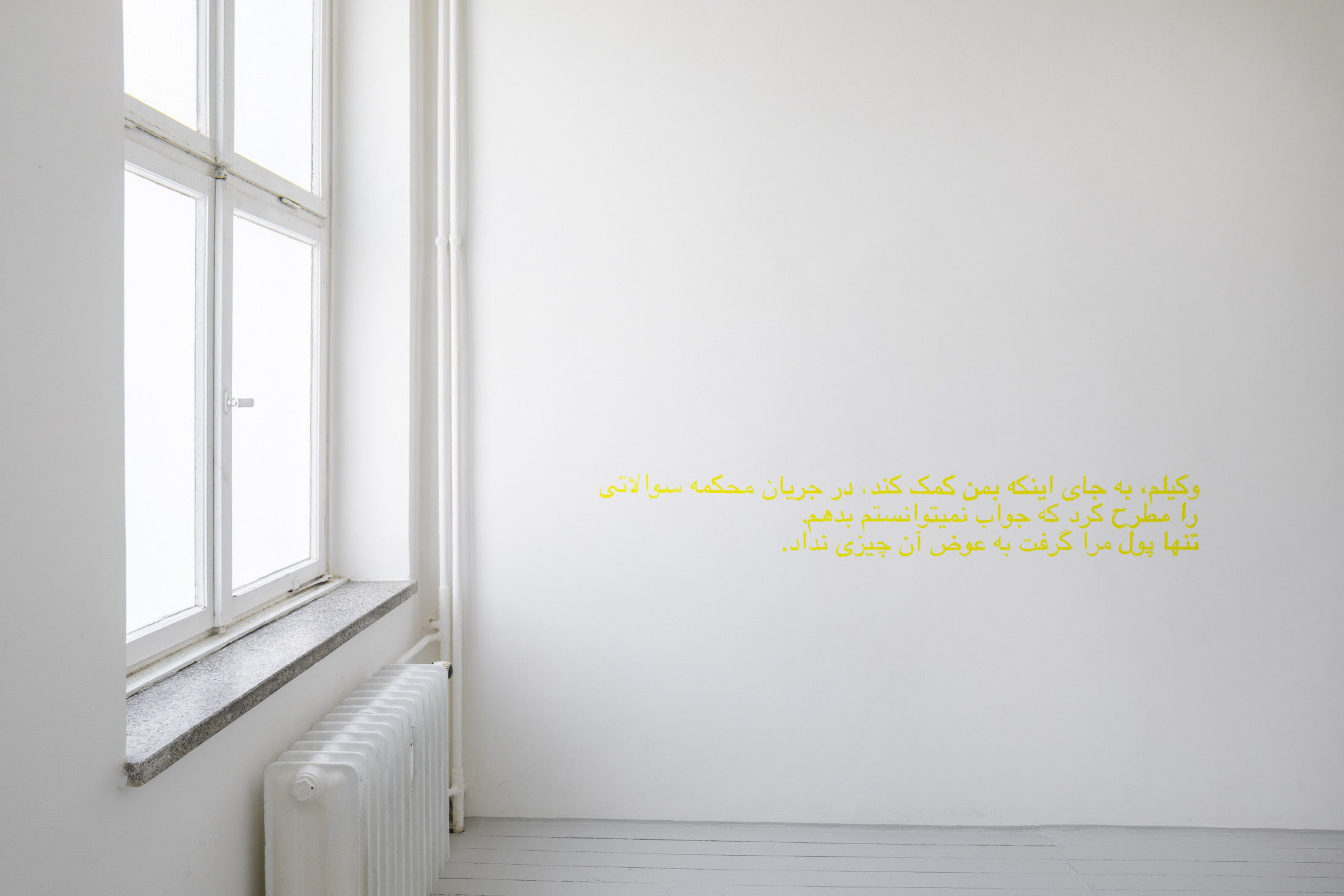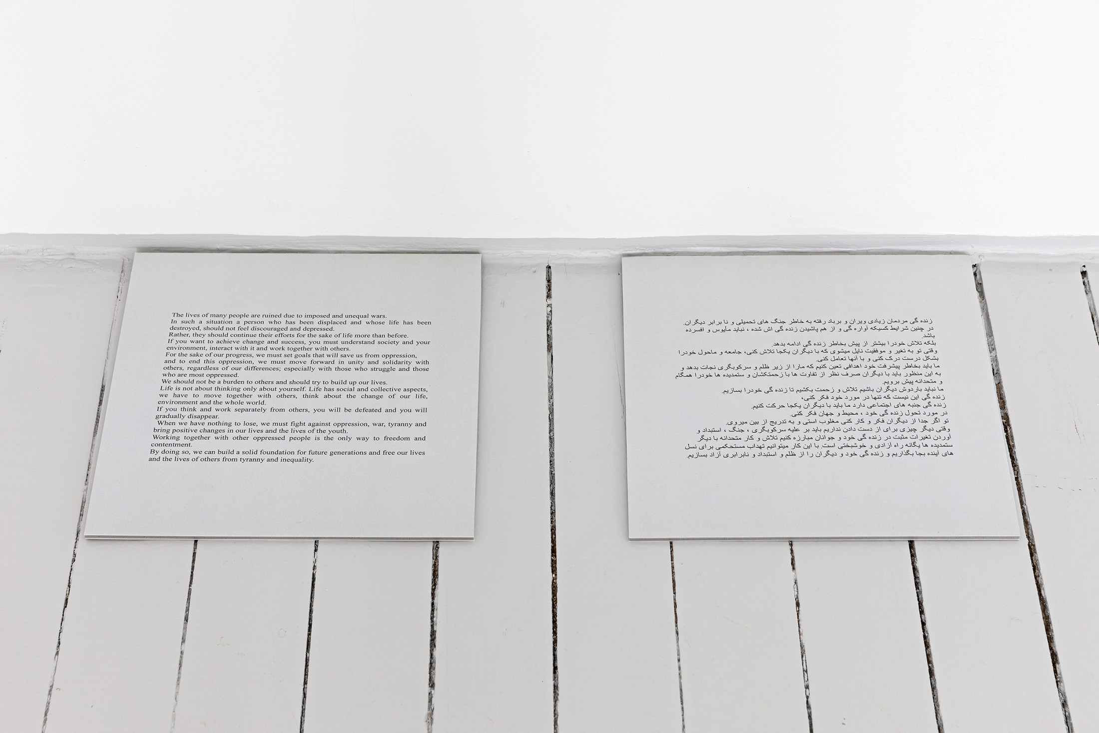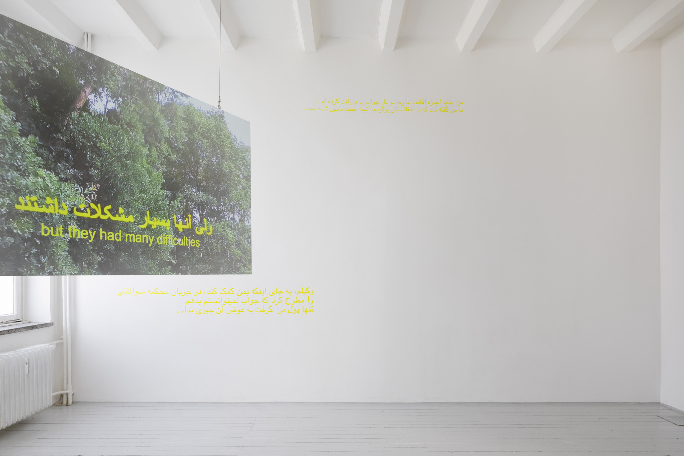 In seinem 1998 erschienenen Buch The Scandals of Translation: Towards an Ethics of Difference (Auf dem Weg zu einer Ethik der Differenz) stellt Venuti fest, dass ‘Domestizierung und Verfremdung mit der Frage zu tun haben, inwieweit eine Übersetzung einen fremden Text an die übersetzende Sprache und Kultur anpasst, und inwieweit sie vielmehr die Unterschiede dieses Textes signalisiert’.“* Die Sprechposition und damit verbundene Über-setzungs-leistung befindet sich also auch schon in der Untertitelung. Diese Form wird in der Wandarbeit von Aidan Jakfar als Mittel benutzt, um eine Verschiebung zu bewirken, sodass innerhalb der Untertitel an der Wand ein neuer, eigener Sprechplatz erschaffen wird, der das Displacement intrinsisch miteinschließt. Durch die Transponierung der Untertitelform und damit des filmischen Bildraums (und dem Nichtraum) an die weiße Ausstellungswand wird man vor die Unfassbarkeit der Geschehnisse ausgesetzt. Du bist im Film. Hinzukommend „vergegenständlicht und äußert sich die abstrakt wirkende Politik in den Realitäten der Personen“**, die hier zitiert werden. Einer Rede, die von der selben Sprechenden aus dem Film geschrieben wurde, begegnen wir in Verbindung mit einem alten Foto aus Afghanistan.