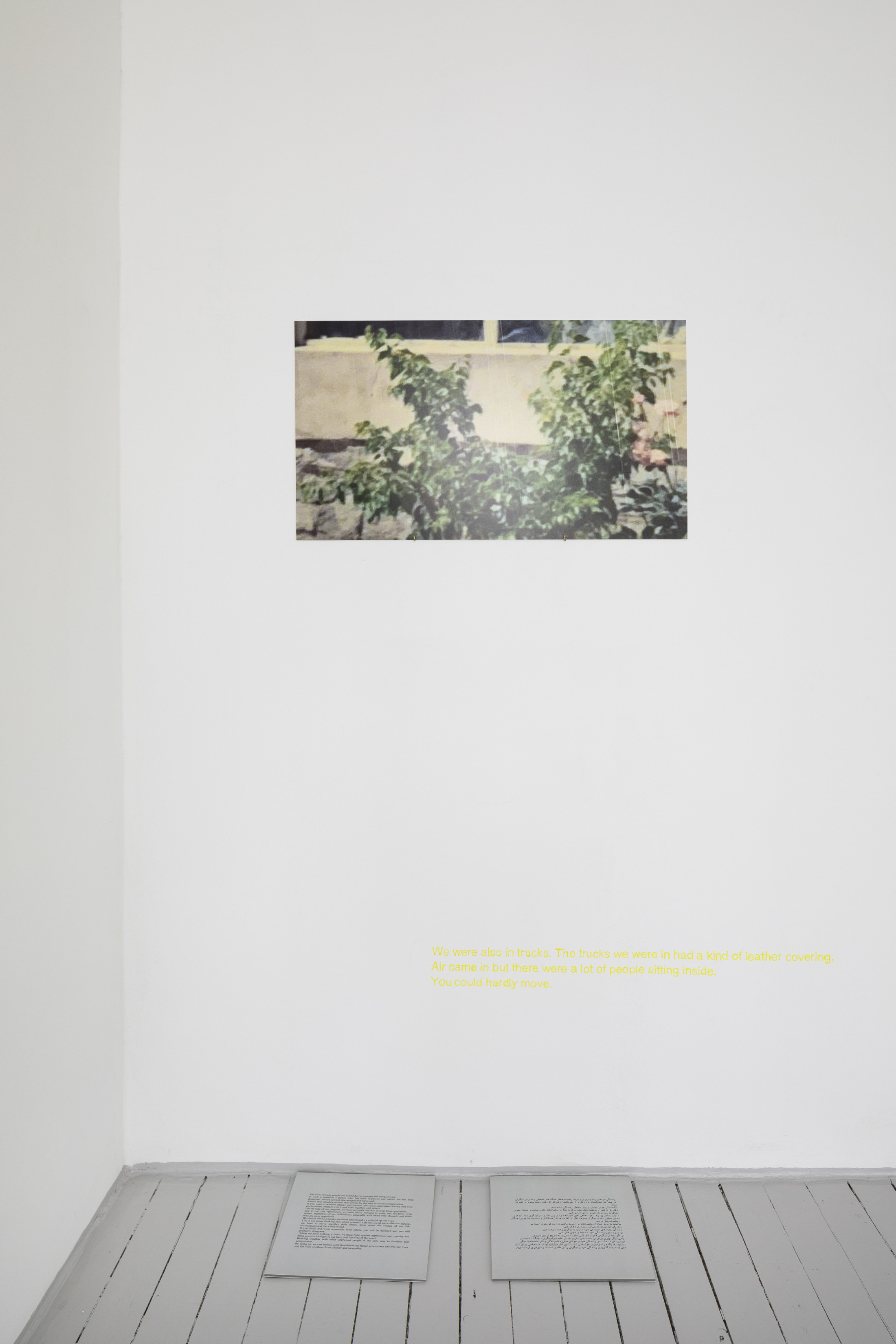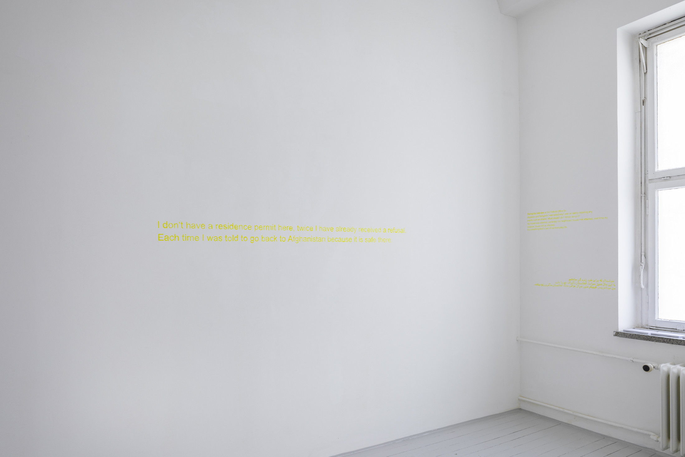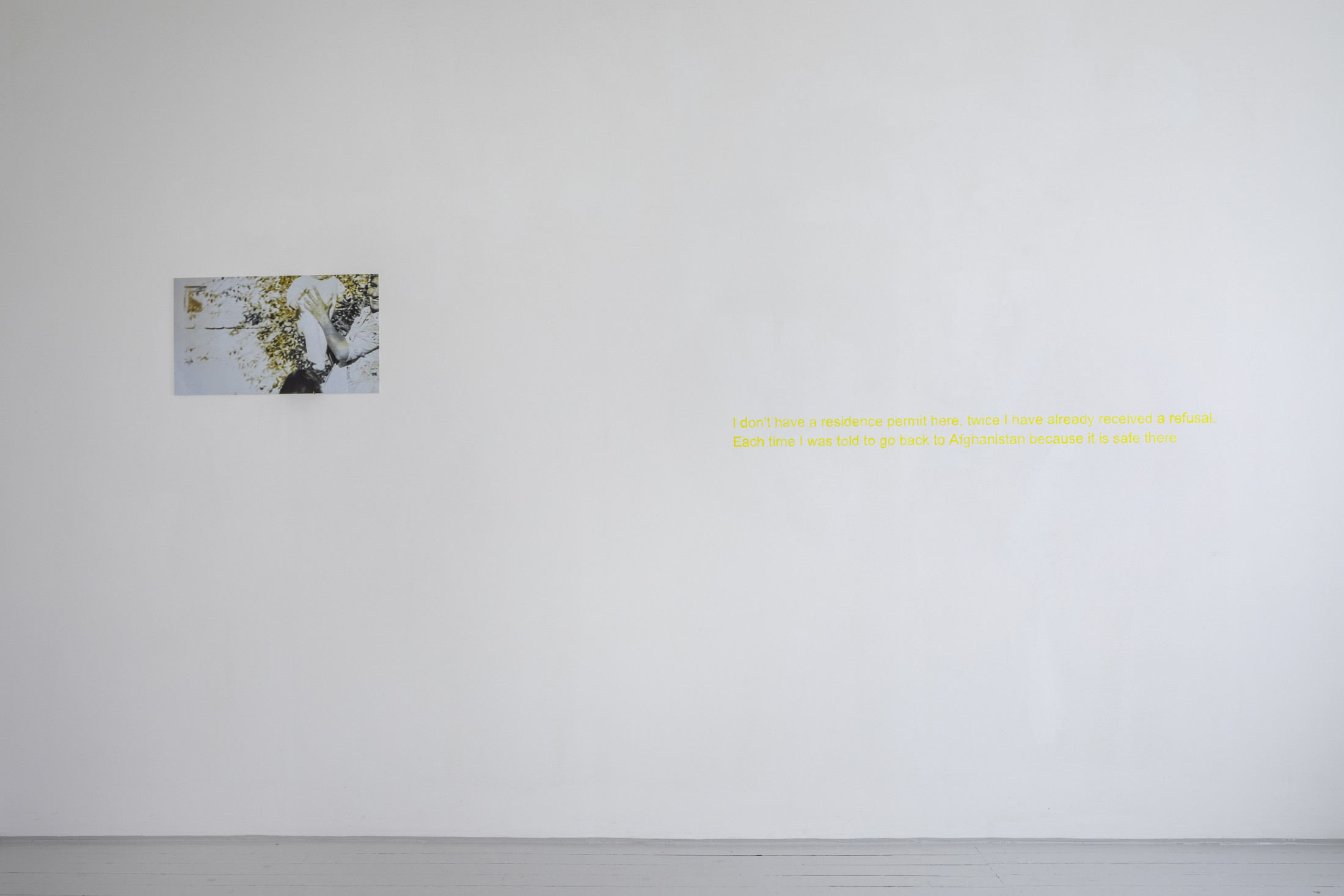 In seinem 1998 erschienenen Buch The Scandals of Translation: Towards an Ethics of Difference (Auf dem Weg zu einer Ethik der Differenz) stellt Venuti fest, dass ‘Domestizierung und Verfremdung mit der Frage zu tun haben, inwieweit eine Übersetzung einen fremden Text an die übersetzende Sprache und Kultur anpasst, und inwieweit sie vielmehr die Unterschiede dieses Textes signalisiert’.“* Die Sprechposition und damit verbundene Über-setzungs-leistung befindet sich also auch schon in der Untertitelung. Diese Form wird in der Wandarbeit von Aidan Jakfar als Mittel benutzt, um eine Verschiebung zu bewirken, sodass innerhalb der Untertitel an der Wand ein neuer, eigener Sprechplatz erschaffen wird, der das Displacement intrinsisch miteinschließt. Durch die Transponierung der Untertitelform und damit des filmischen Bildraums (und dem Nichtraum) an die weiße Ausstellungswand wird man vor die Unfassbarkeit der Geschehnisse ausgesetzt. Du bist im Film. Hinzukommend „vergegenständlicht und äußert sich die abstrakt wirkende Politik in den Realitäten der Personen“**, die hier zitiert werden. Einer Rede, die von der selben Sprechenden aus dem Film geschrieben wurde, begegnen wir in Verbindung mit einem alten Foto aus Afghanistan.