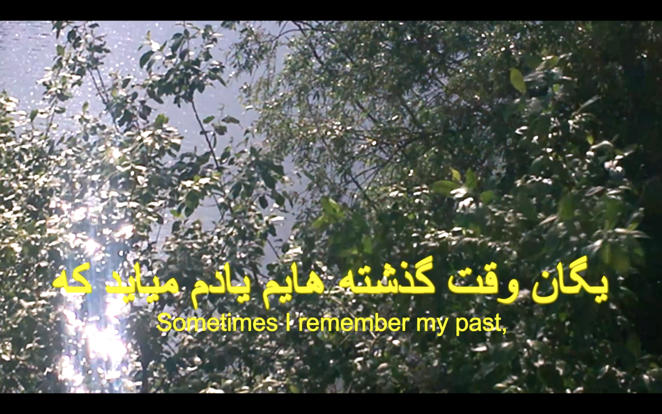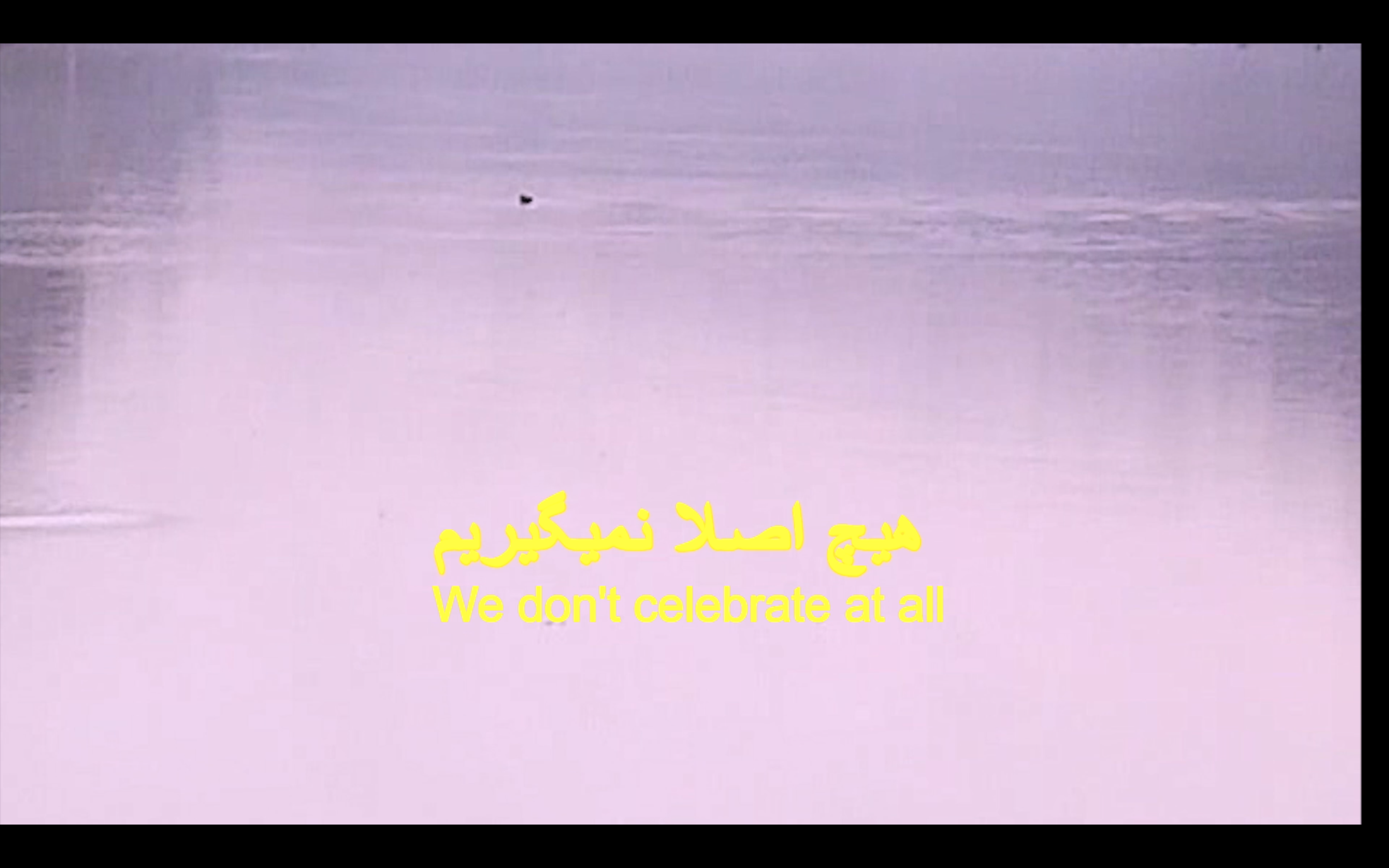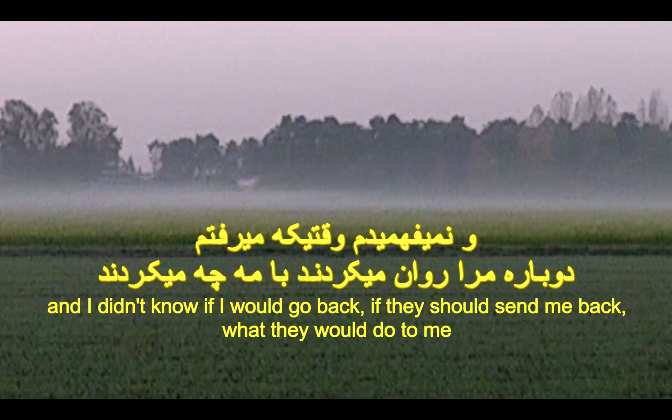 Im Vordergrund jeder Aufnahme sind größere Untertitel in Farsi (Farsi-speaking audience) und kleinere in Englisch (international audience) unterlegt. Diese audiovisuelle Überführung in zwei konzise, parallele Zeilen rahmt jedes einzelne Bild mit, sodass es als Zitatbild für sich stehen könnte, wie die Postkarte eines Kinofilms. Aus der Perspektive der Übersetzerinnen, der Interpretations-Mittlerinnen zwischen language(n) gibt es zwei Varianten einen Film zu untertiteln: