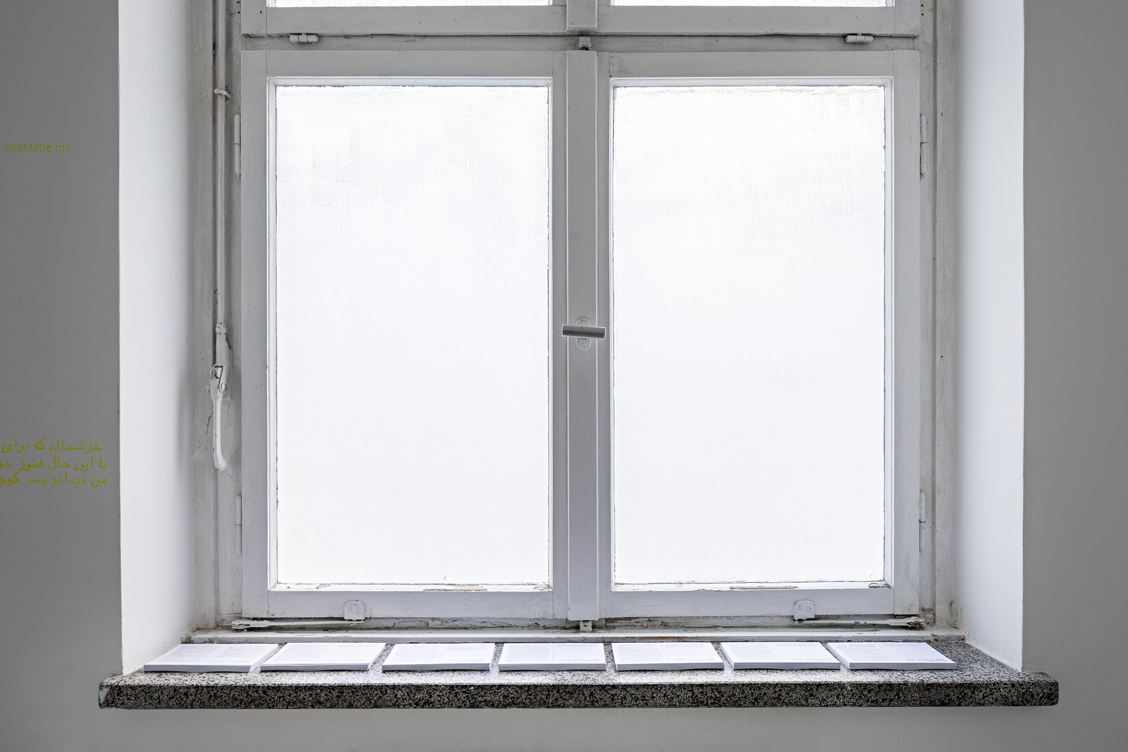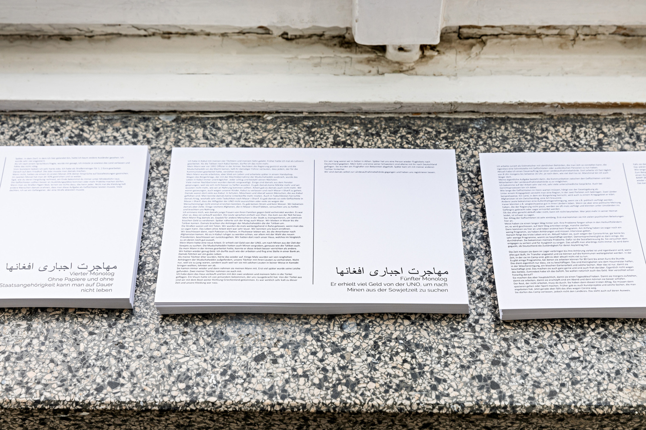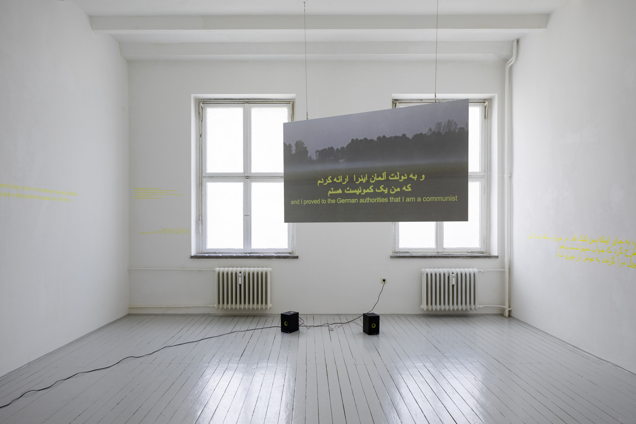Aus den über Jahre hinweg geführten Gesprächen zwischen Aidan Jakfar und anderen Geflüchteten, entstand ein transkribierter und editierter Textkörper, den sie zu insgesamt acht Monologen und einem Buch mit dem Titel Stimmen Afghanischer Geflüchteter aus Deutschland zusammenfasste. Es ist eine Auseinandersetzung mit der Bundesrepublik Deutschland unter dem Gesichtspunkt der Einwanderung. Basierend auf diesem Textkörper verwebt Jakfar in der Ausstellung „we shall sing songs of love“ diverse kinematographische Mittel um unterschiedliche Sprecher*innenpositionen und Stimmen und deren Realitäten zu manifestieren. Where do we speak from, where do we sing from and to whom?