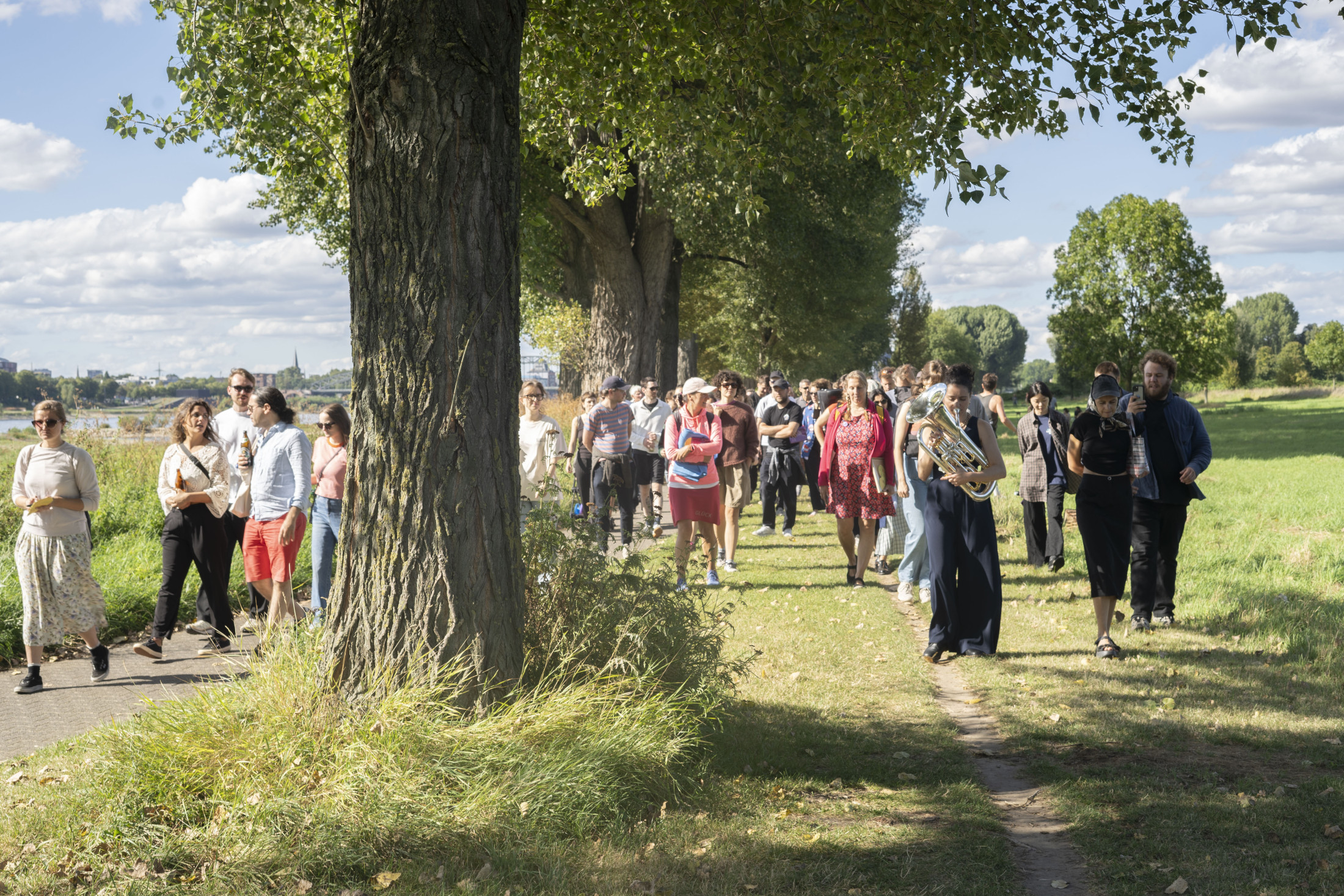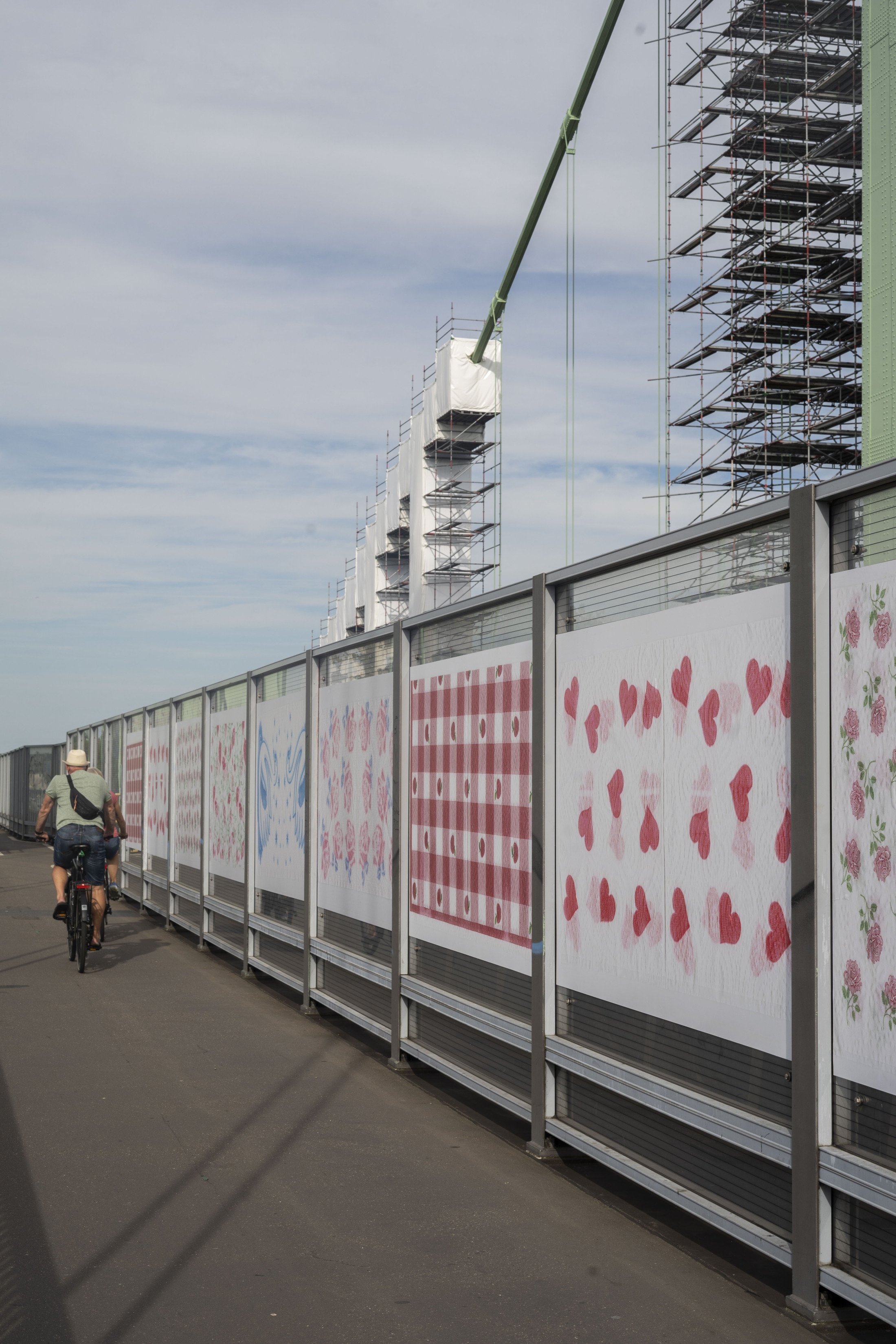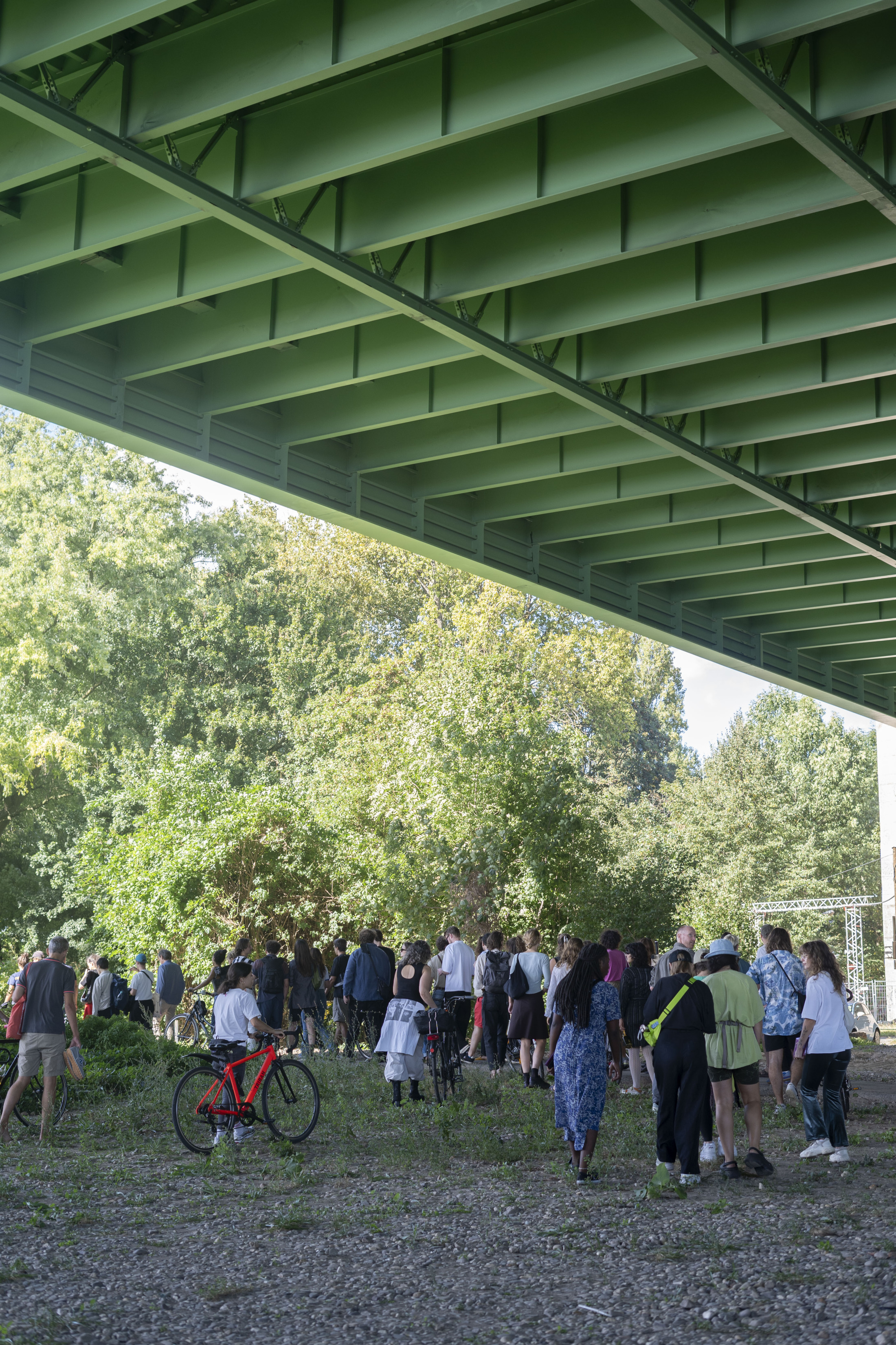 Within the framework of Über Brücken – Bridging, seven days of events featured local and international artistic positions. The invited artists engaged with the respective places, districts, and their inhabitants, as well as with the histories of the individual bridges. Each event day is devoted to one of the seven bridges. The events took take place over three years, starting in September 2022 with the Mülheimer Brücke. Over the following months, the venues moved from north to south across the Zoobrücke, the Hohenzollernbrücke, the Deutzer Brücke, the Severinsbrücke, the Südbrücke, and the Rodenkirchener Brücke, each including a guided walk across one of the bridges from bank to bank, from east to west and back again.